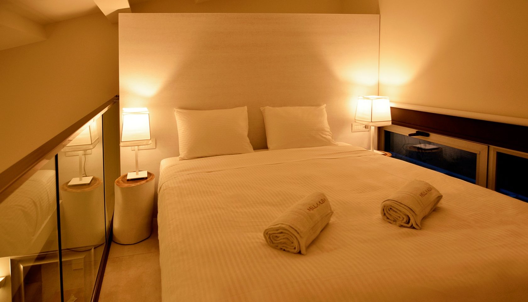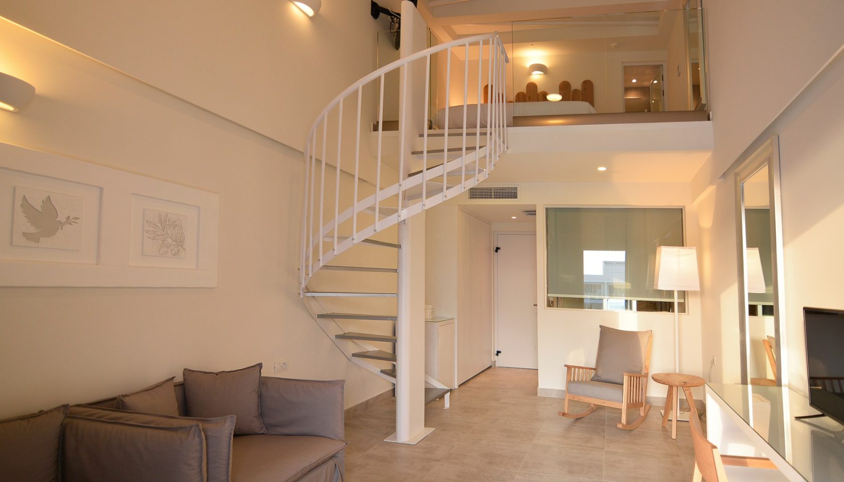 Our Junior Suites, positioned on the upper level, are designed according to the high standards of modern minimalism. These elegant suites feature a king-size bed on the semi-floor with an en suite WC, while the ground level offers a relaxing space with a sofa bed or armchairs. The thoughtfully designed bathroom, complete with a walk-in shower, can also be found on the ground level.